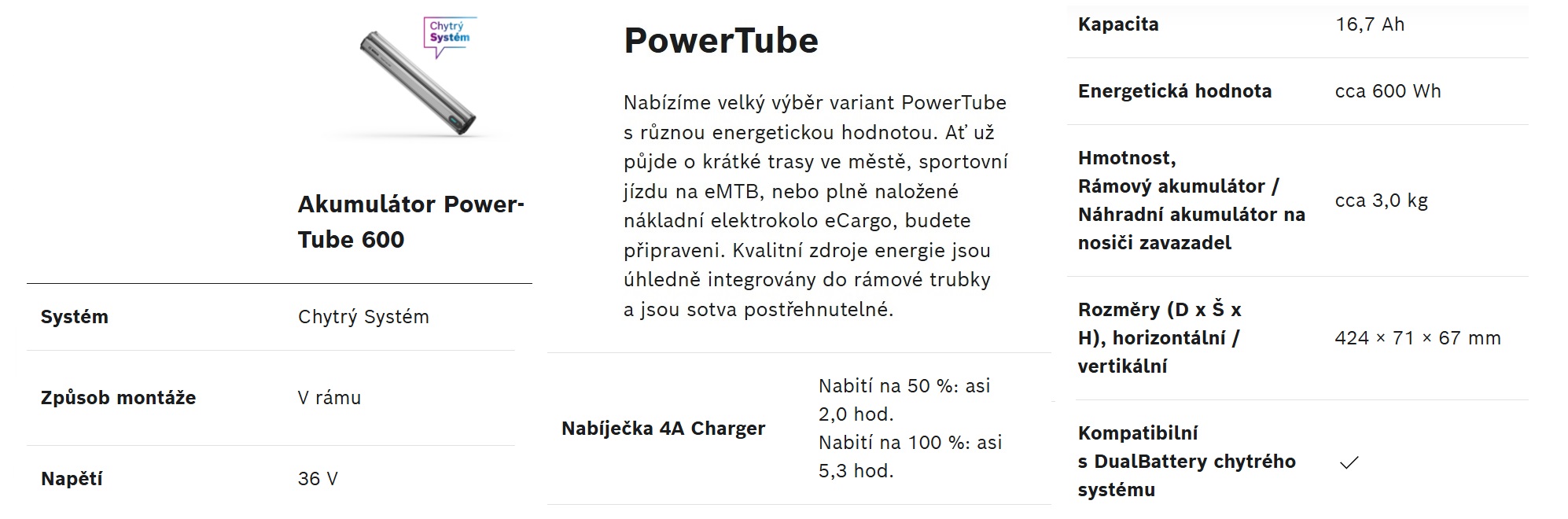 Baterie Bosch PowerTube s kapacitou 540 nebo 600 Wh je perfektně integrována do spodní trubky, ale lze ji také kdykoli vyjmout pro nabití. S přídavným prodlužovačem dojezdu Bosch PowerMore 250 získáte o 250 Wh více, celkem až 850 Wh. Velikosti M, L a XL jsou kompatibilní se systémem Bosch DualBattery.