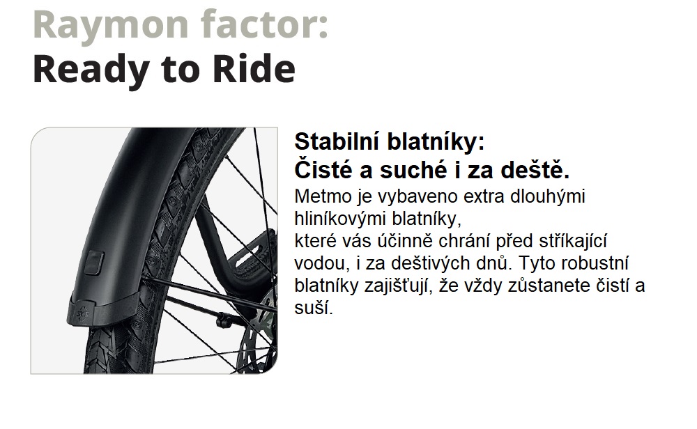 Další komponenty, jako je vidlice SR Suntour XCM32-ATB s 80 mm zdvihem a pláště Continental eContact Plus, zajišťují pohodlnou a stabilní jízdu na různých površích. Elektrokolo Metmo je vybaveno také praktickými doplňky, jako jsou blatníky Curana Apollo a nosič Raymon MIK HD, což z něj činí ideální volbu pro každodenní použití.