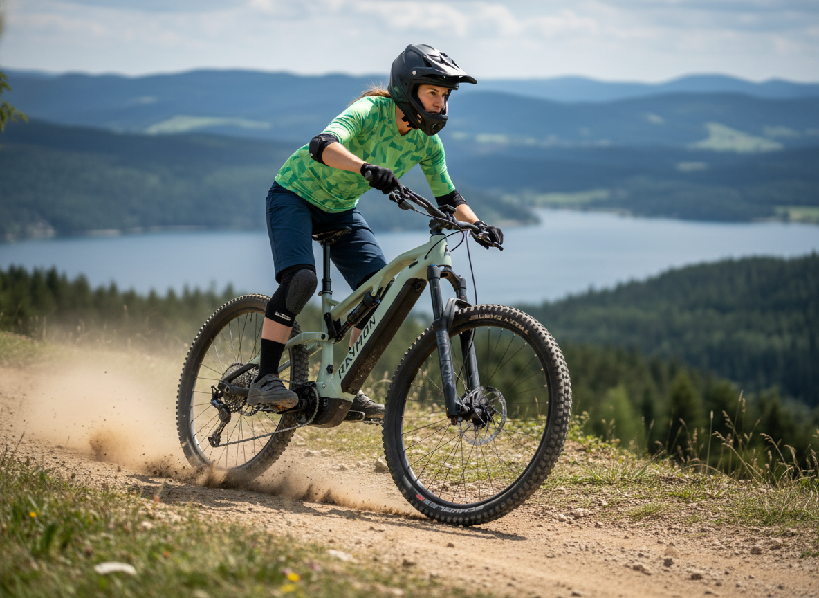Raymon Trailray 150 Pro je moderní trailové celoodpružené elektrokolo na 29" kolech, které kombinuje svižnou ovladatelnost do běžných trailů s jistotou v rychlejších a rozbitějších pasážích. Základ tvoří hliníkový rám Alloy 6061 s vyjímatelnou baterií a trailovým zdvihem 140 mm vzadu, doplněný o vidlici RockShox Lyrik Select 150 mm – tedy osvědčenou kombinaci pro ježdění od flow trailů až po techničtější sjezdy.