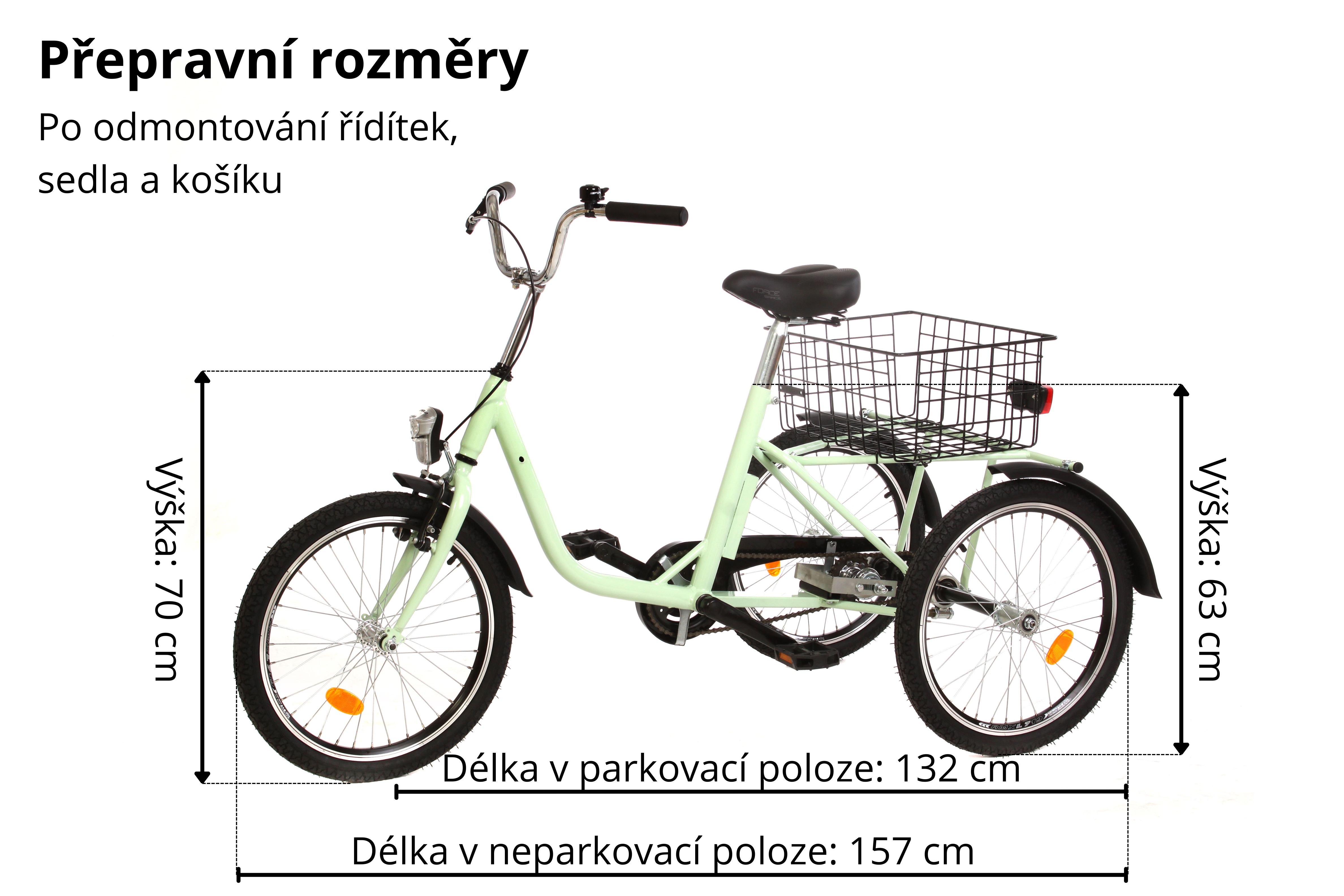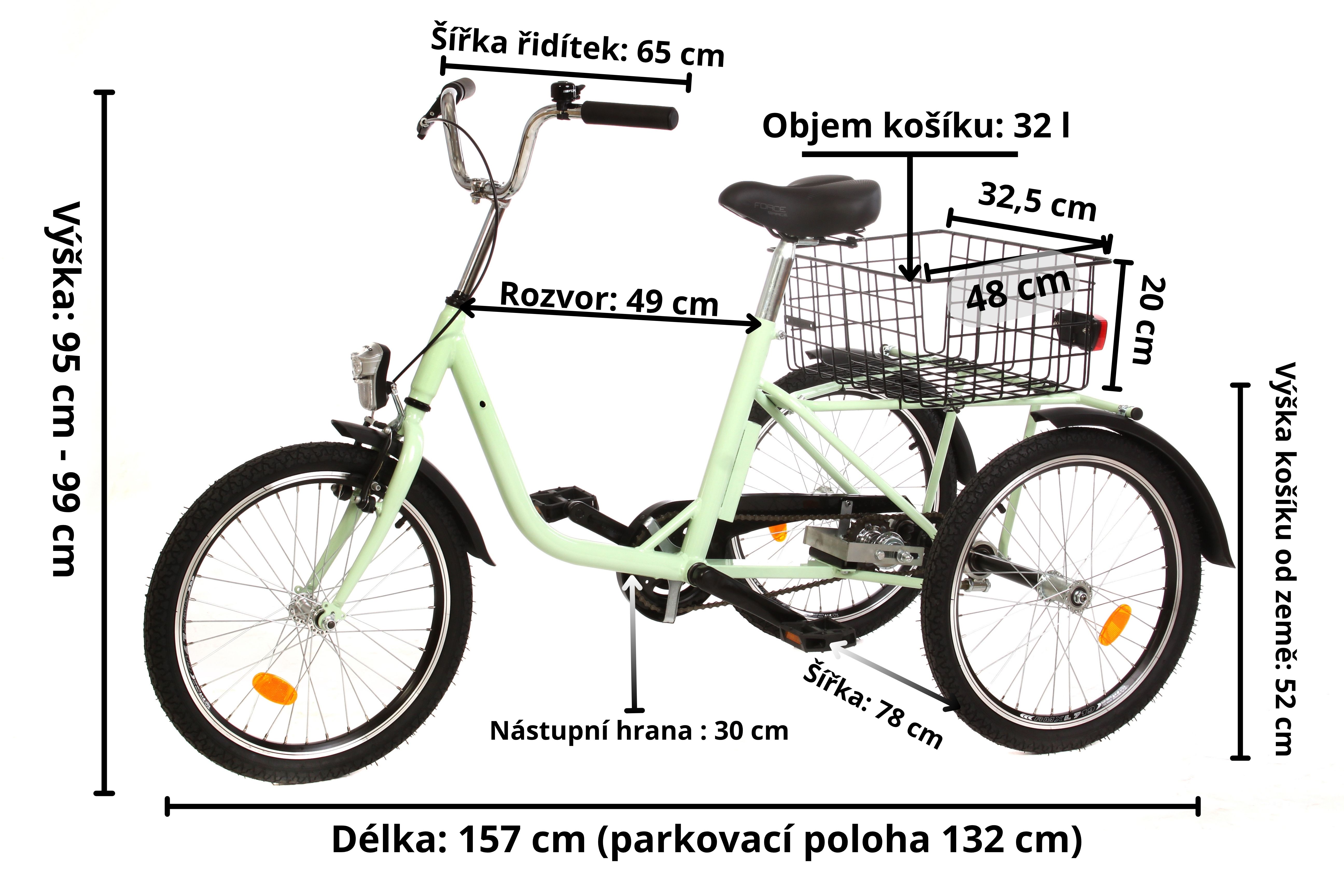 Přední a zadní ráfkovou V-brzdou a zapouzdřenou průmyslovou středovou osou. Díky jedno rychlostnímu převodu bude vaše jízda velice příjemná a bezproblémová. Objem zadního velkokapacitního koše činí 32 l. Tříkolka projede dveřmi o rozměrech až 80 cm.